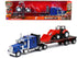 Kenworth W900 Semi Truck in Blue with Flatbed Trailer and Red Farm Tractor with Front Loader